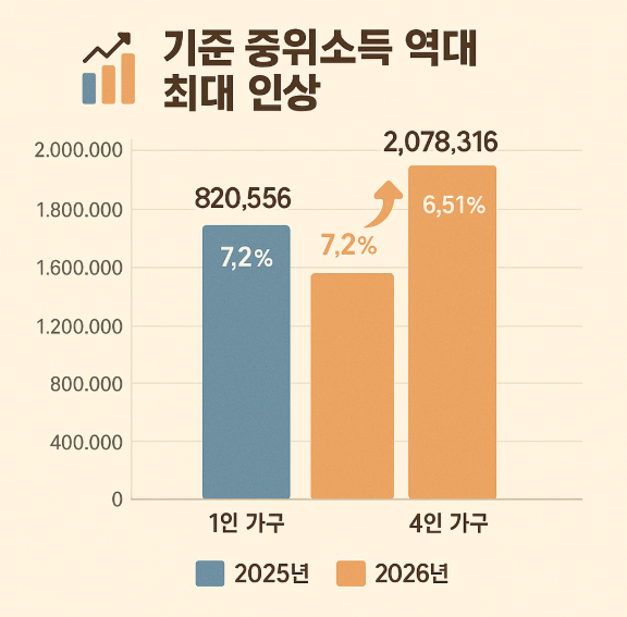 2026๋…„์—๋Š” ๊ธฐ์ดˆ์ƒํ™œ๋ณด์žฅ์ œ๋„์˜ ํ•ต์‹ฌ ๊ธฐ์ค€์ธ ‘๊ธฐ์ค€ ์ค‘์œ„์†Œ๋“’์ด ์—ญ๋Œ€ ์ตœ๋Œ€ํญ์œผ๋กœ ์ธ์ƒ๋ฉ๋‹ˆ๋‹ค.