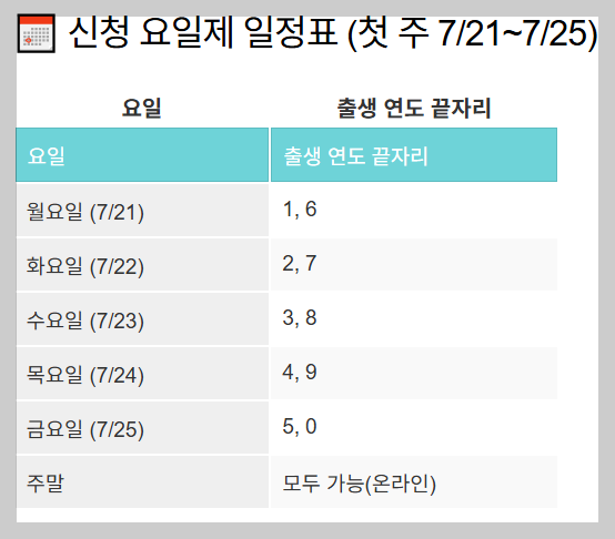A. ์‹ ์ฒญ ์ฒซ ์ฃผ(7/21~7/25)๋Š” ์ถœ์ƒ ์—ฐ๋„ ๋์ž๋ฆฌ์— ๋”ฐ๋ฅธ ์š”์ผ์ œ ์‹ ์ฒญ, ๋ฐ˜๋“œ์‹œ ๋ณธ์ธ ๋ช…์˜ ์‹ ์ฒญ, ๋ฏธ์„ฑ๋…„์ž๋Š” ์„ธ๋Œ€์ฃผ๊ฐ€ ์‹ ์ฒญ ์›์น™์„ ์œ ์˜ํ•˜์„ธ์š”.