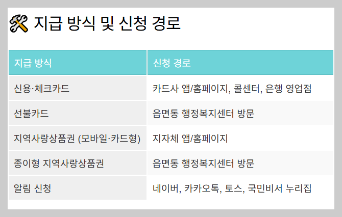 • ์ง€์—ญ์‚ฌ๋ž‘์ƒํ’ˆ๊ถŒ: ์ง€์ž์ฒด ์•ฑ, ํ™ˆํŽ˜์ด์ง€, ์๋ฉด๋™ ํ–‰์ •๋ณต์ง€์„ผํ„ฐ