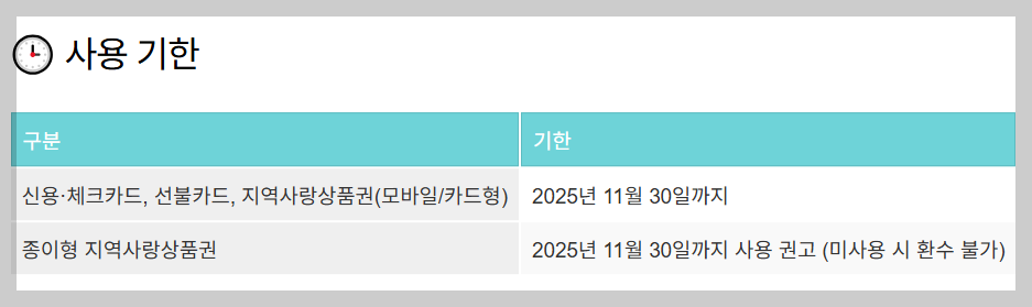 A. 2025๋…„ 11์›” 30์ผ๊นŒ์ง€ ์‚ฌ์šฉ ๊ฐ€๋Šฅํ•˜๋ฉฐ, ์ดํ›„ ๋ฏธ์‚ฌ์šฉ ๊ธˆ์•ก์€ ํ™˜์ˆ˜๋ฉ๋‹ˆ๋‹ค.