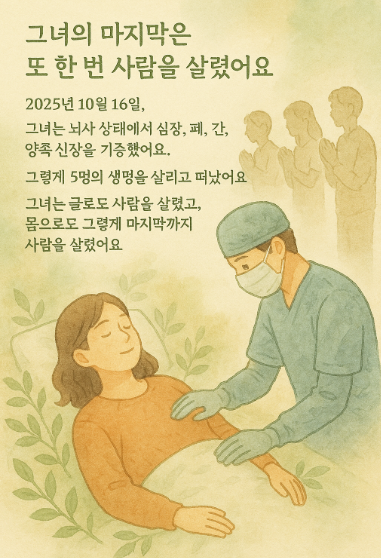 2025년 10월 16일, 그녀는 장기기증을 하고 뇌사 상태로 우리 곁을 떠났다고 해요.