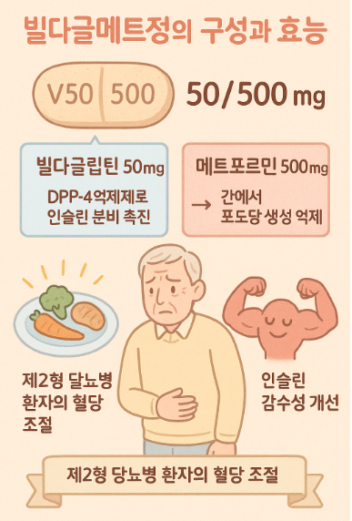 ๋นŒ๋‹ค๊ธ€๋ฉ”ํŠธ์ • 50/500mg์€ ๋‹ค์Œ ๋‘ ์„ฑ๋ถ„์˜ ๋ณตํ•ฉ์ œ๋กœ ๊ตฌ์„ฑ๋ฉ๋‹ˆ๋‹ค: