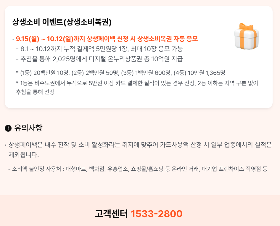 - 쑰건: 2025λ 8μ 1μΌ ~ 10μ 12μΌ μΈμ μ¬μ©μ² 5λ§ μ κ²°μ μ λ³΅κΆ 1μ₯ (μ΅λ 10μ₯κΉμ§))