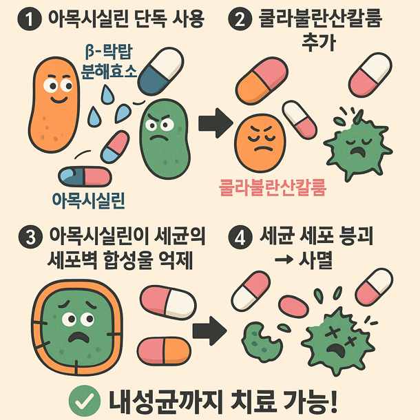 • ์•„๋ชฉ์‹œ์‹ค๋ฆฐ๊ณผ ํ•จ๊ป˜ ์‚ฌ์šฉ๋˜์–ด, **๋‚ด์„ฑ๊ท (β-๋ฝํƒ ๋ถ„ํ•ด๊ท )**๋„ ์น˜๋ฃŒ ๊ฐ€๋Šฅ