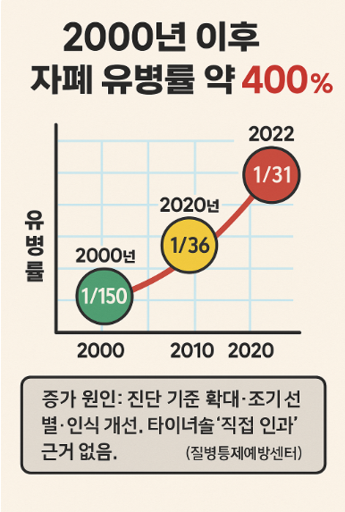 • ์ฃผ์„: “์ฆ๊ฐ€ ์›์ธ: ์ง„๋‹จ ๊ธฐ์ค€ ํ™•๋Œ€·์กฐ๊ธฐ ์„ ๋ณ„·์ธ์‹ ๊ฐœ์„ . ํƒ€์ด๋ ˆ๋†€ ‘์ง์ ‘ ์ธ๊ณผ’ ๊ทผ๊ฑฐ ์—†์Œ.”(์งˆ๋ณ‘ํ†ต์ œ์˜ˆ๋ฐฉ์„ผํ„ฐ)