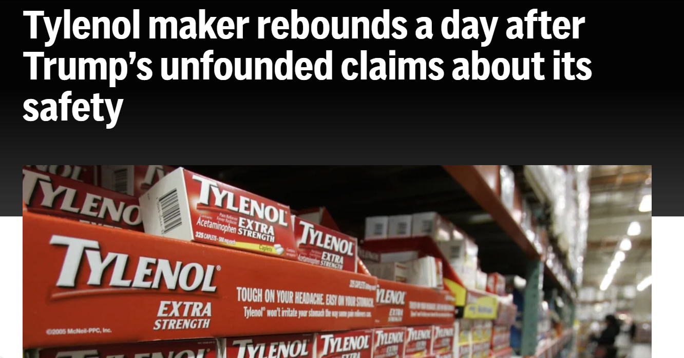 ์˜๋ฌธ ์›๋ฌธ ๐Ÿ‘‰ Tylenol maker rebounds a day after Trump’s unfounded claims about its safety ๋ฒˆ์—ญ ๐Ÿ‘‰ “ํŠธ๋Ÿผํ”„์˜ ๊ทผ๊ฑฐ ์—†๋Š” ์•ˆ์ „์„ฑ ์ฃผ์žฅ ์ดํ›„, ํƒ€์ด๋ ˆ๋†€ ์ œ์กฐ์‚ฌ ์ฃผ๊ฐ€๊ฐ€ ํ•˜๋ฃจ ๋งŒ์— ๋ฐ˜๋“ฑํ–ˆ๋‹ค”