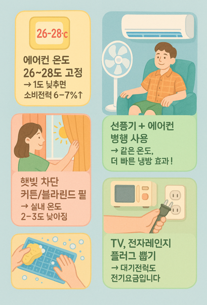 - ๐ก๏ธ ์์ด์ปจ ์จ๋ 26~28๋ ๊ณ ์ → 1๋ ๋ฎ์ถ๋ฉด ์๋น์ ๋ ฅ 6~7%↑