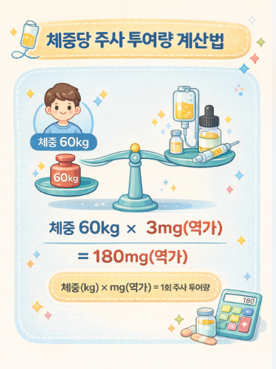 - ์ฑ์ธ: 1์ผ 1ํ ์ฒด์ค kg๋น 3mg(์ญ๊ฐ)์ 3ํ ๋ถํ ์ ๋งฅ์ฃผ์ฌ