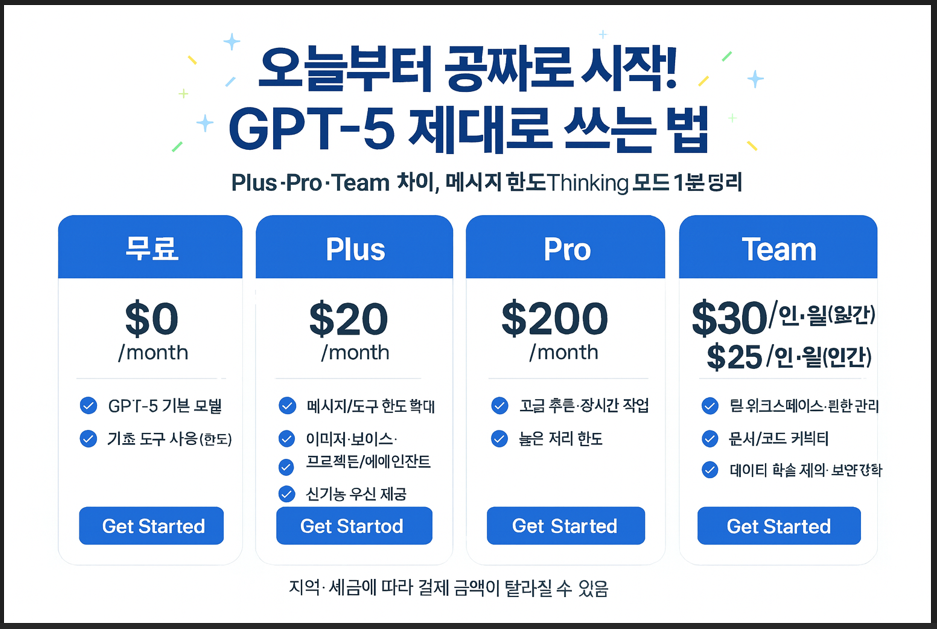์ฑ—GPT5 ๋ฌด๋ฃŒ ์‹œ์ž‘ ๊ฐ€์ด๋“œ๋ถ€ํ„ฐ ChatGPT Plus·Pro·Team ๊ฐ€๊ฒฉ/๊ธฐ๋Šฅ ์ฐจ์ด, ๋ฉ”์‹œ์ง€ ํ•œ๋„์™€ Thinking ๋ชจ๋“œ๊นŒ์ง€ ํ•œ ๋ฒˆ์— ์ •๋ฆฌํ–ˆ์Šต๋‹ˆ๋‹ค.
